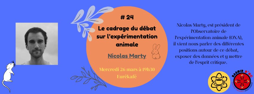 Conférence le 26 mars : le cadrage du débat sur l’expérimentation animale26/03/202519/08/2025 Conférence de Nicolas Marty, président de l’OXA, sur invitation du Rasoir d’Oc à l’Eurêkafé, le 26 mars à Toulouse : exposition des données et des définitions de base, représentation du débat dans les médias, comment la question « peut-on se passer de l’expérimentation animale ? » s’est imposée au point d’occulter toutes les autres, quelles expertises ces questions devraient appeler, quelles positions tiennent les philosophes spécialistes sur les aspects éthiques ? Tarifs : 5€ adhérents (réduit) ; 7€ non-adhérents Consommation en libre-service Voir l’événement sur Facebook — Vidéo YouTube (le son commence à 7′) Transcription de la vidéo → Mes autres contenusprécédentExpérimentation animale, 1h avec Nicolas MartysuivantTrois conférences aux Rencontres de l’Esprit Critique les 12 et 13 avril